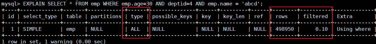 EXPLAIN SELECT * FROM emp WHERE emp.age=30 AND deptid=4 AND emp.name = 'abcd';