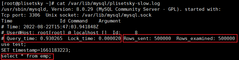 6. 根据log位置 查看慢查询日志:cat /var/lib/mysql/plisetsky-slow.log