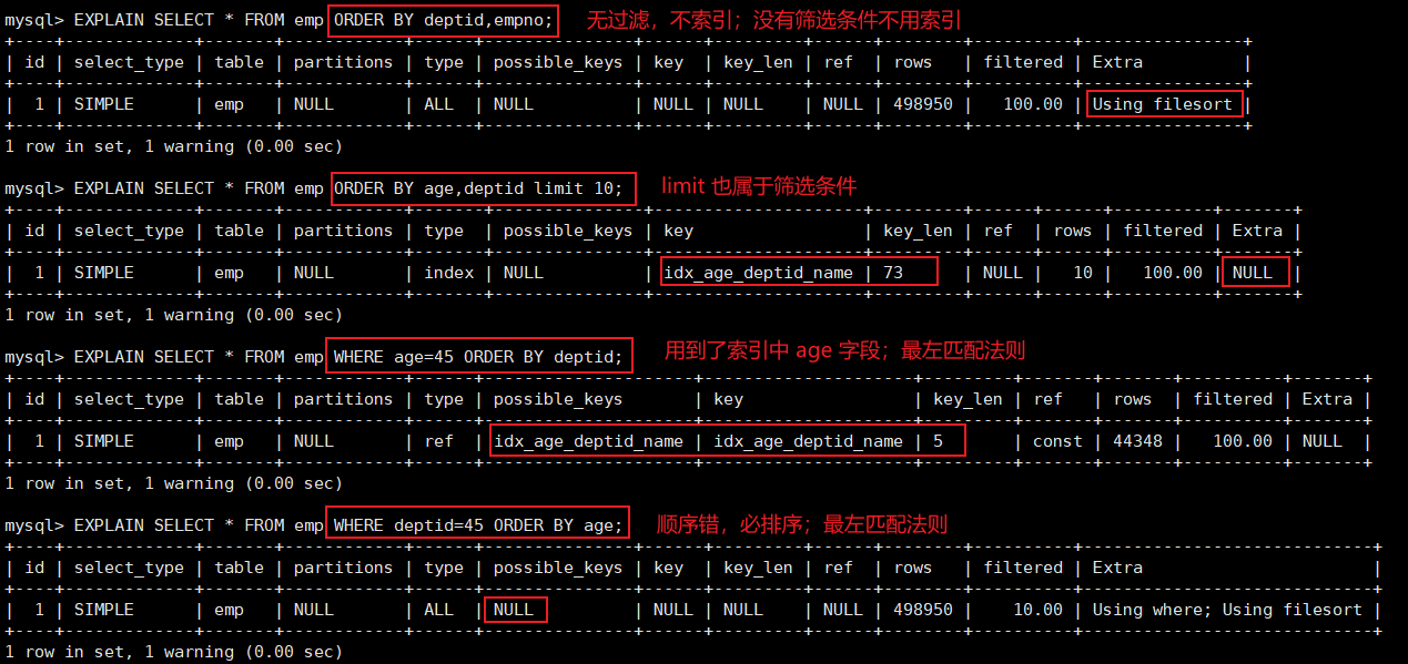 2. 顺序错,必排序;过滤条件要符合最左匹配法则