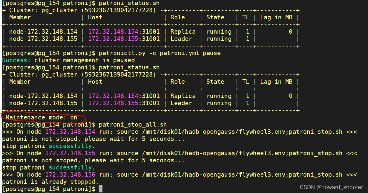 前者暂停patroni,这样patroni就与postgresql/opengauss断开了联系,此时可以杀掉patroni进程,而postgresql/opengauss仍然在正常运行。