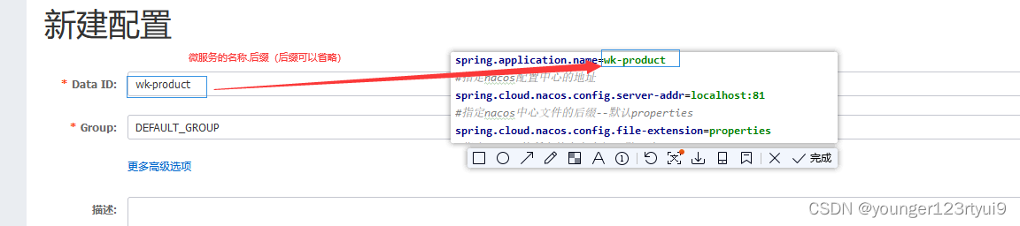spring.application.name=wk-product #指定nacos配置中心的地址 spring.cloud.nacos.config.server-addr=localhost:81 #指定nacos中心文件的后缀--默认properties spring.cloud.nacos.config.file-extension=properties