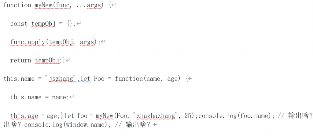 this.name = ‘jszhang’;let Foo = function() { this.name = ‘zhazhazhang’;}let foo = new Foo();console.log(foo.name); // 输出啥?console.log(window.name); // 输出啥?