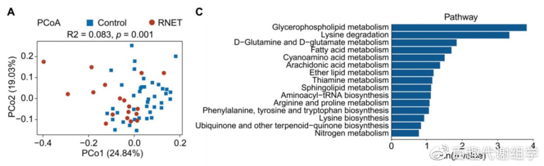 3 RNET代谢组富集分析采用非靶向代谢组学技术检测粪便样本,探讨RNET患者的代谢谱变化。RNET组和对照组的代谢组学特征(基于Bray-Curtis距离)具有统计学显著差异(adonis: R2= 0.083, p=0.001, 图4A),且不受性别、BMI、年龄、吸烟和饮酒史等临床因素的显著影响。实验共鉴定到545种代谢产物,其中104种代谢物具有显著差异。与RNET组微生物菌群减少不同的是,多数差异代谢物显著富集于RNET组,而富集于对照组的仅26种(图4B)。RNET代谢组的主要特征是脂类和类脂分子的显著上调;相比之下,对照组表现为有机杂环化合物、有机酸及其衍生物以及有机氮化合物的上调。进一步的KEGG分析显示,在RNET患者中,关键通路甘油磷脂代谢发生了改变(图4C)。从而推测,脂质代谢异常参与了RNET的发病机制。