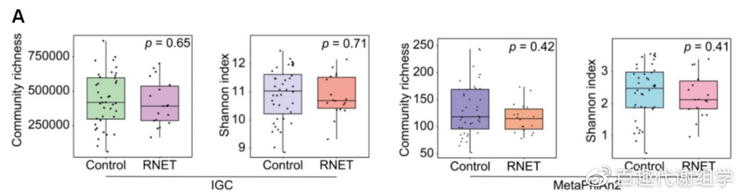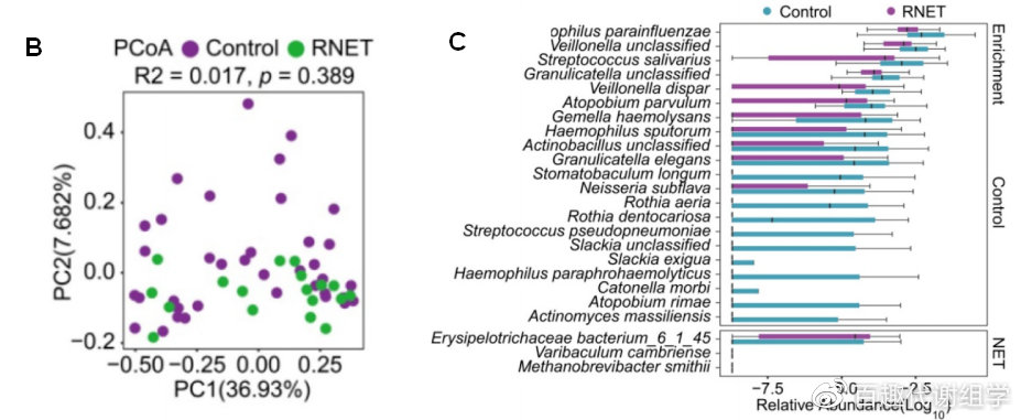 该项研究描述了RNET患者肠道生态微环境的失调,其特征是微生物种类减少、脂质和类脂分子的异常聚集,从而推断紊乱的生态结构可能参与了此类肿瘤的致瘤过程。这项工作有助于挖掘菌群及代谢紊乱在RNET发病机制中的潜在作用,为基于微生物群的诊断和治疗提供研究方向。