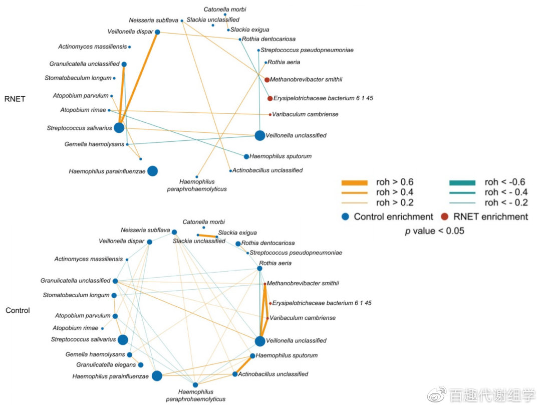 作者分别从属水平和种水平上进行共现网络分析展示微生物群落结构和组成。相比健康组,RNET组的种水平网络复杂度降低,连通性减弱(图2),这可能与RNET组中肠菌减少有关,另外在属水平网络中也有类似的发现。