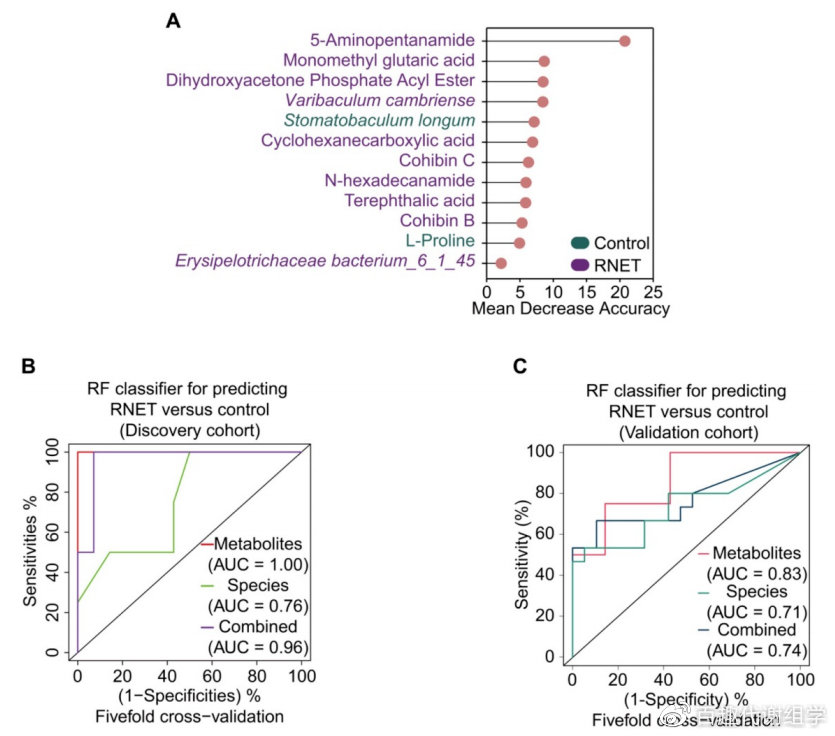 为了挖掘潜在的诊断微生物和代谢特征,作者根据对照组和RNET组的差异菌群和差异代谢物构建了随机森林分类器(RF)模型。筛选得到一组标志物,包括3种菌群微生物和9种代谢物,筛选出的标志物多数在RENT组中富集(图6A)。随后,作者利用性别、年龄、BMI、吸烟及饮酒史等进行校正,结果显示筛选出的标志物不受上述临床因素的显著影响。预测模型指出在发现队列中,代谢物在检测RNET方面具有高灵敏性,其曲线下面积(AUC)值为1.0(图6B)。与单一菌群微生物预测模型相比(AUC=0.76),微生物和代谢物的复合模型在分类准确性方面有显著提高(AUC=0.96)。此外,作者又选取一支队列(15名RNET患者,19名对照)作为独立的外部验证集(图6C),结果显示代谢物验证模型的AUC为0.83,仍然具有较高的准确性,加入菌群后的复合模型AUC为0.74,优于单独的菌群预测效果(AUC=0.71)。这些结果表明,菌群和代谢物的随机森林分类模型作为一种非侵入性工具,在RNET人群的早期诊断中具有很大的发展潜力。