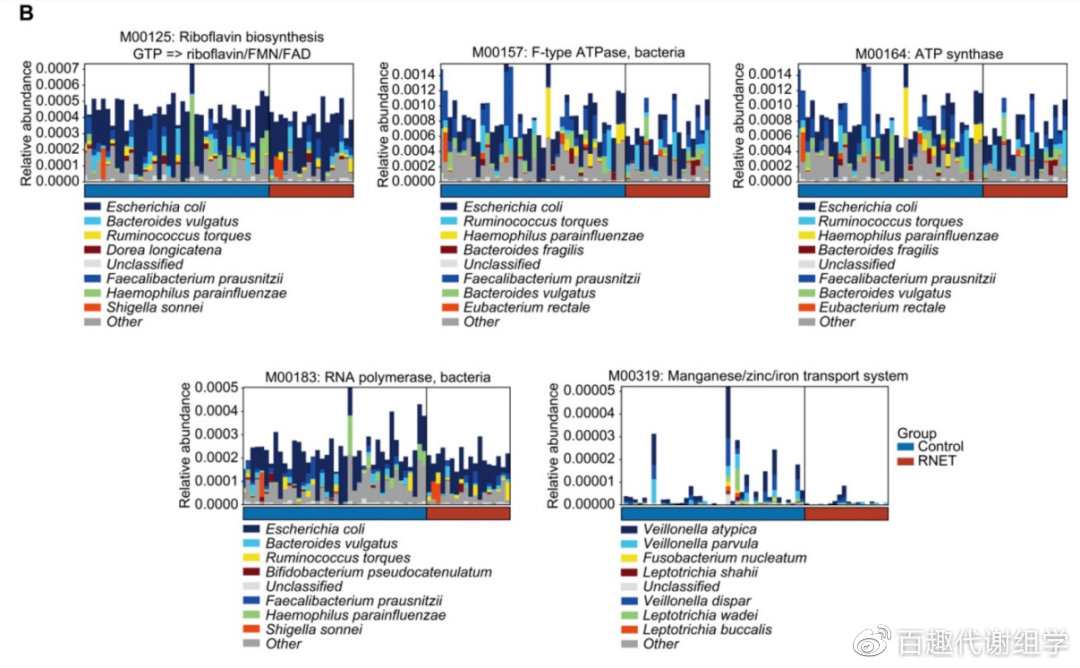 2 RNET微生物组的功能特征基于in-house和HUMAnN2,进行KEGG通路富集分析,富集到的通路分别为69条(in-house)、38条(HUMANn2),其中11条重叠通路(图3A)。基于HUMANn2富集到的通路中,多数于健康组中富集;重叠通路中,那些与能量代谢(M00157, M00164)、RNA聚合酶 (M00183)和维生素生物合成(M00125)相关的途径也多数在健康组中富集。基于HUMAnN2的输出结果,作者进一步确定了参与上述路径的优势种(图3B)。菌群Escherichia coli,Faecalibacterium prausnitzii,Bacteroides vulgatus,Haemophilus parainfluenzae, Ruminococcus torques主要富集于健康人群中,是上述路径的主要贡献者。同样富集于健康人群中的通路Manganese/zinc/iron transportation (M00319),优势菌群则主要由Veillonella属的一些微生物组成,如Veillonella atypica,Veillonella dispar和Veillonella parvula。总的研究结果表明,微生物群落组成的变化通过扰乱宿主生理功能来驱动似病状态。