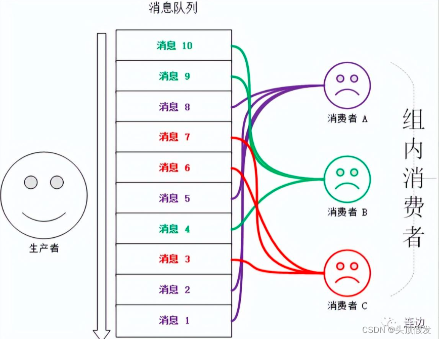 多个消费者配合协作来消费同一个消息队列,比如消息队列中有10条消息,三个消费者分别消费其中的某些消息,比如消费者A消费消息1、2、5、8,消费者B消费消息4、9、10,而消费者C消费消息3、6、7。