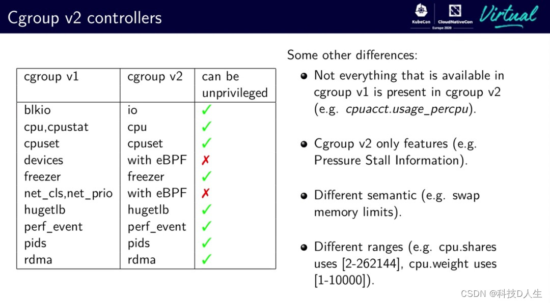 Linux 内核宣布 cgroups v2 API 稳定已经有两年时间,不少的 Linux 发行版本已经开始默认使用 cgroup v2。详细介绍推荐阅读官方文档:https://www.kernel.org/doc/Documentation/cgroup-v2.txt。KEP 主要是兼容 cgroup v2,功能上是没有明显变化的。需要注意的是,KEP 内容并不包括 v2 的新功能 (v1 不支持的功能),另外,也不包括 cgroup v1 废弃的内容。
