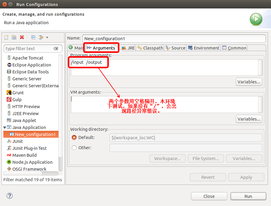 右键点击刚创建的 WordCount.java,选择 Run As -> Run Configurations,在此处可以设置运行时的相关参数(如果 Java Application 下面没有 WordCount,那么需要先双击 Java Application)。切换到 "Arguments"栏,在Program arguments 处填写参数**“****/input /****output”**。