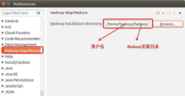 此时会弹出一个窗体,点击选择Hadoop Map/Reduce 选项,选择 Hadoop 的安装目录(例如:/home/hadoop/hadoop)。