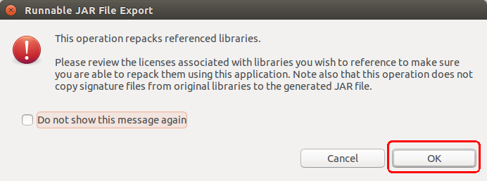 4. 点击OK完成导出可运行jar(测试方法与运行Hadoop自带的Wordcount方法一样,不在赘述)