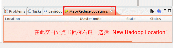点击Eclipse软件右下角的Map/Reduce Locations 面板,在面板中单击右键,选择New Hadoop Location。