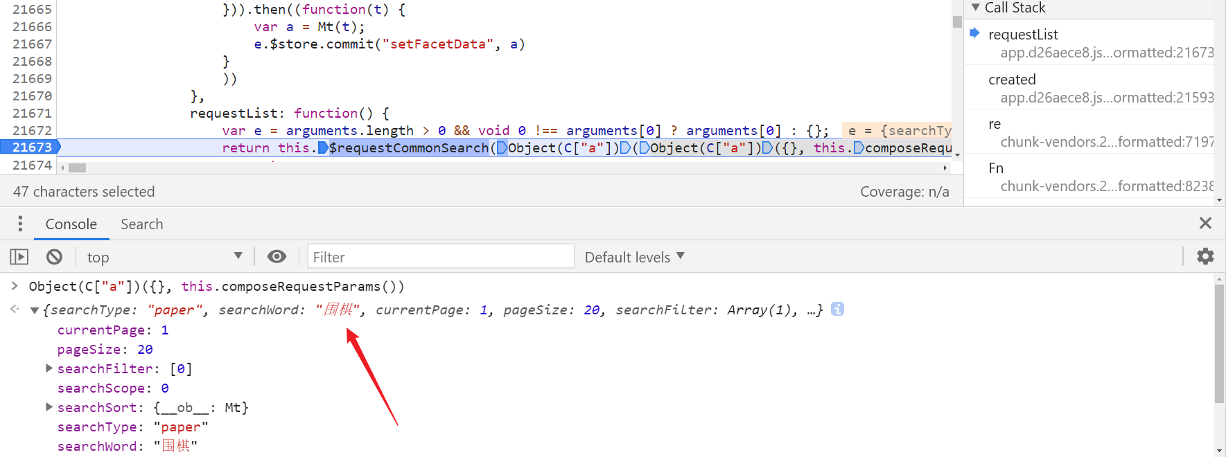 点击后面链接跳转进去,在 app.d26aece8.js 文件中,在第 21673 行打下断点调试分析,Object(C["a"])({}, this.composeRequestParams()) 的控制台打印内容中存在搜索的关键词,包括一些原始请求参数: