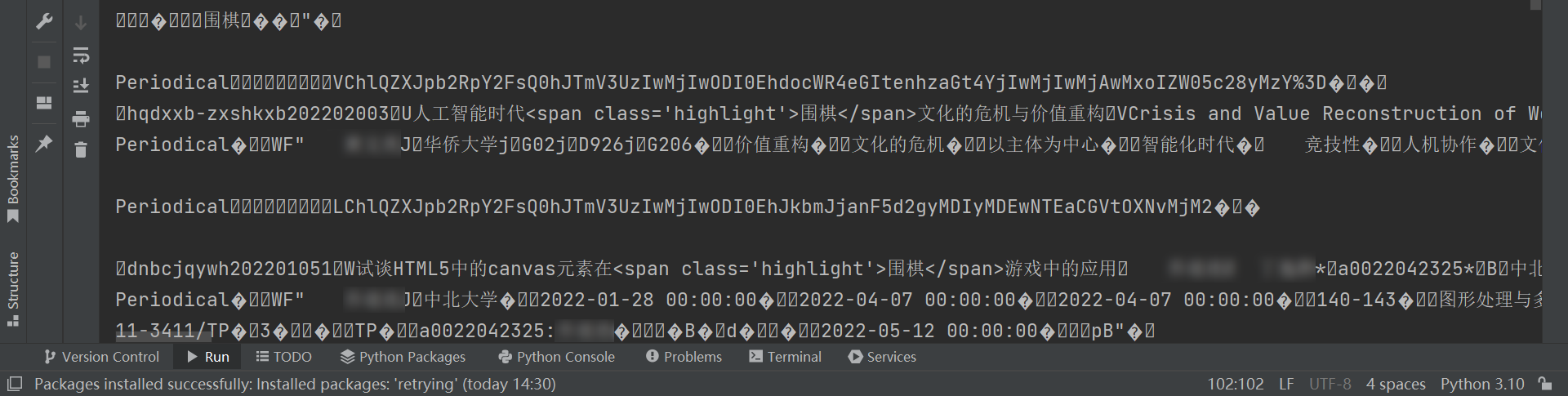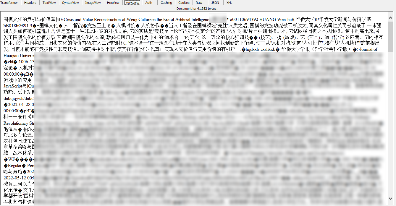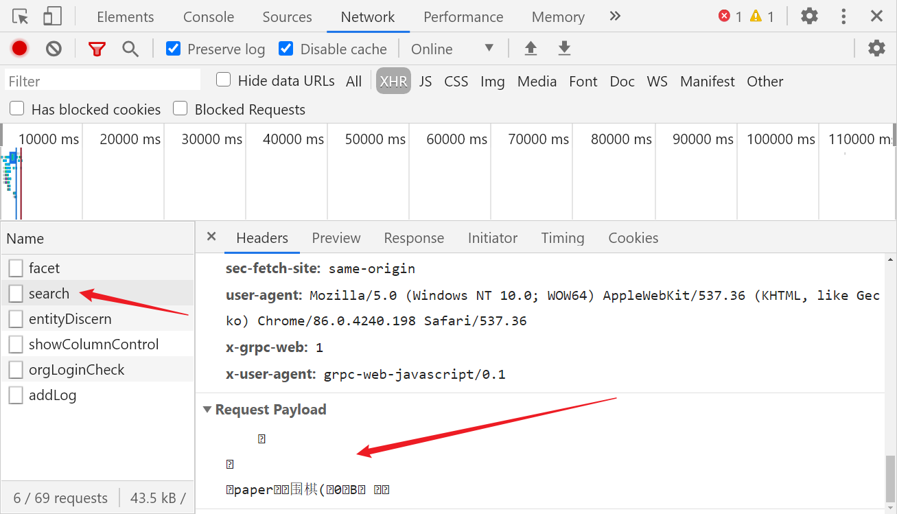 F12 打开开发者人员工具,在 Network 的筛选栏选择 XHR,刷新网页,会看到抓包到了一些数据,search 中能找到我们输入的关键词围棋,但是发现请求被混淆了 :