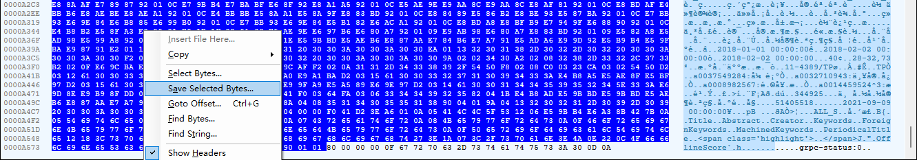 黑色部分,去掉开头五个字节和末尾二十个字节,将剩余内容选中,右键选择 Save Selected Bytes To File,将其保存为 .bin 文件:
