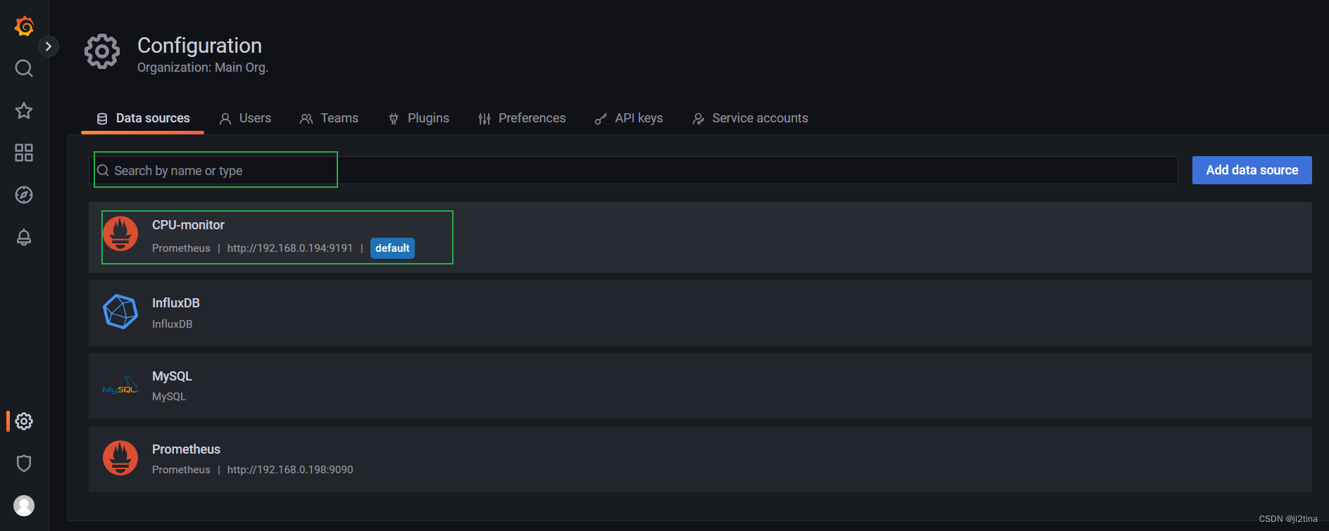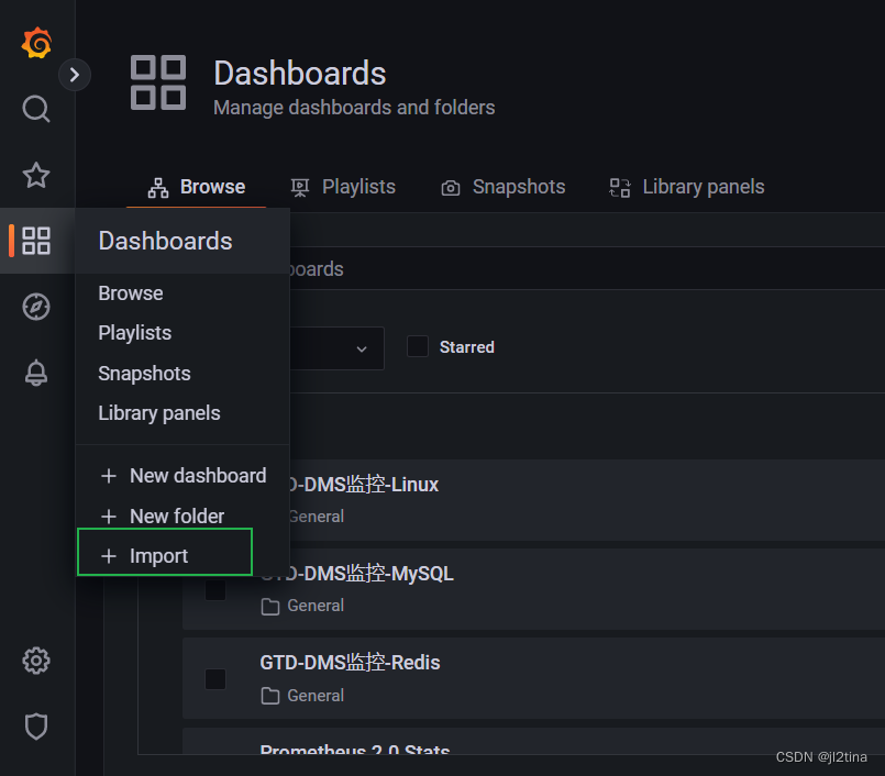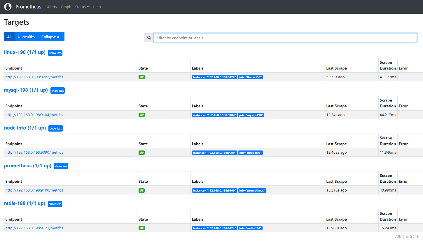 # 启动后,配置prometheus.yml [root@gtdms ~]# vi /etc/prometheus/prometheus.yml scrape_configs: # The job name is added as a label `job=` to any timeseries scraped from this config. - job_name: "prometheus" # metrics_path defaults to '/metrics' # scheme defaults to 'http'. static_configs: - targets: ["192.168.0.198:9100"] - job_name: "node info" static_configs: - targets: ['192.168.0.198:9090'] - job_name: "mysql-198" static_configs: - targets: ['192.168.0.198:9104'] - job_name: "redis-198" static_configs: - targets: ['192.168.0.198:9121'] - job_name: "linux-198" static_configs: - targets: ['192.168.0.198:9222'] # 重新启动prometheus [root@gtdms ~]# systemctl restart prometheus