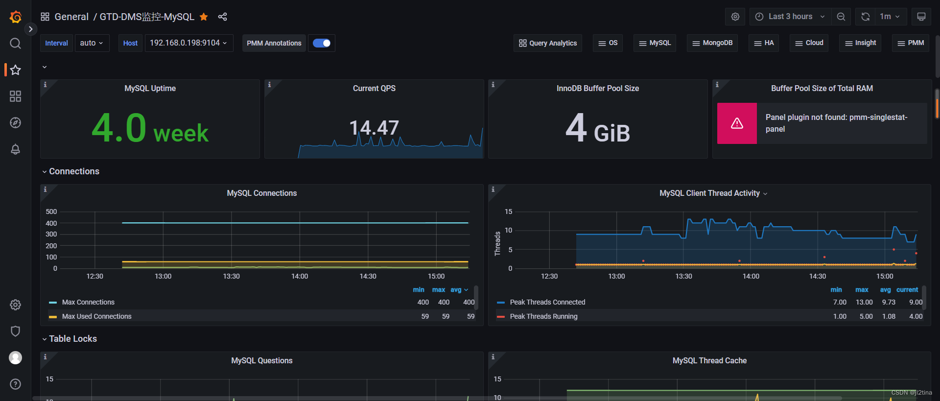 # 在MySQL服务器上创建监控用户 mysql -uroot -p123456 #创建mysql的监控用户专用账号 mysql>CREATE USER 'mysql_monitor'@'localhost' IDENTIFIED BY '123' WITH MAX_USER_CONNECTIONS 3; mysql> grant select,replication client, process on *.* to 'mysql_monitor'@'localhost' identified by '123'; Query OK, 0 rows affected, 1 warning (0.00 sec) mysql> flush privileges; Query OK, 0 rows affected (0.03 sec) mysql> exit Bye # 将上面创建的mysql用户信息写入mysqld_exporter配置文件(新创建一个) [root@gtdms ~]# vim /root/mysqld_exporter/.my.cnf [client] user=mysql_monitor password=123 另外,官方提供了一种方式采用环境变量方式配置账号密码 # 启动mysqld_exporter nohup /root/mysqld_exporter/mysqld_exporter --config.my-cnf=/root/mysqld_exporter/.my.cnf & # 确认是否正常启动(默认端口9104) [root@gtdms ~]# netstat -lnptu | grep 9104 tcp6 0 0 :::9104 :::* LISTEN 32688/mysqld_export