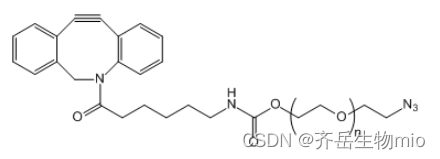 点击化学——DBCO(二苯并环辛炔)是一种环炔烃,可以通过在水溶液中通过应变促进的1,3-偶极环加成反应与叠氮化物反应,这种生物正交反应也称为无铜点击反应。 该反应具有选择性和生物相容性,因此互补试剂可以与功能生物系统形成共价键。 无铜点击反应一直是无催化剂生物共轭的有力工具。 DBCO试剂在水性缓冲液中具有稳定性,可用于以高特异性和反应性标记叠氮化物修饰的生物分子。