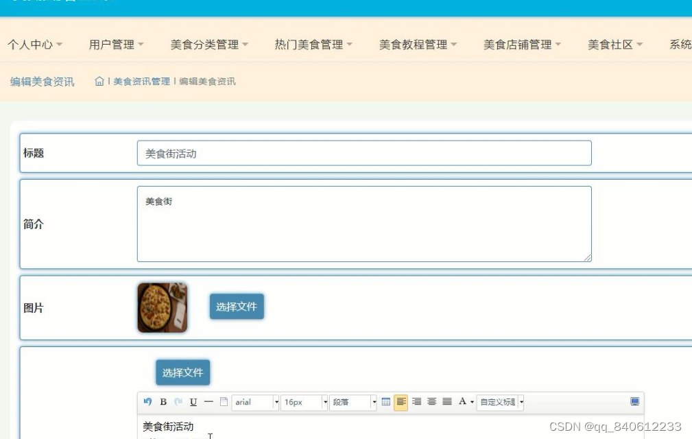 热门美食,在热门美食页面通过填写美食名称、美食分类、图片、地区、口味、特色、视频等信息进行推荐,