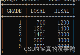 mysql-> select * from salgrade;//从salgrade表查询所有字段