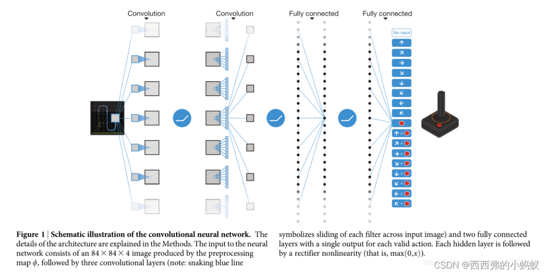 fig1.卷积神经网络示意图。方法中对体系结构的细节进行了说明。神经网络的输入由预处理图生成的84x84x4图像组成,然后是三个卷积层(注:蛇形蓝线表示每个filter(卷积核)在输入图像上滑动)和两个完全连接的层,每个有效操作有一个单独的输出。每个hide layer(隐含层)后面都有一个整流器非线性