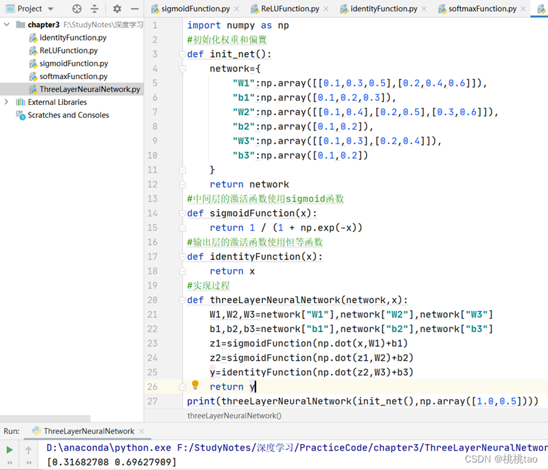 *A=XW+B,中间层使用sigmoid函数作为激活函数,输出层使用恒等函数作为激活函数(输出层的神经元数量需要根据待解决的问题来决定)