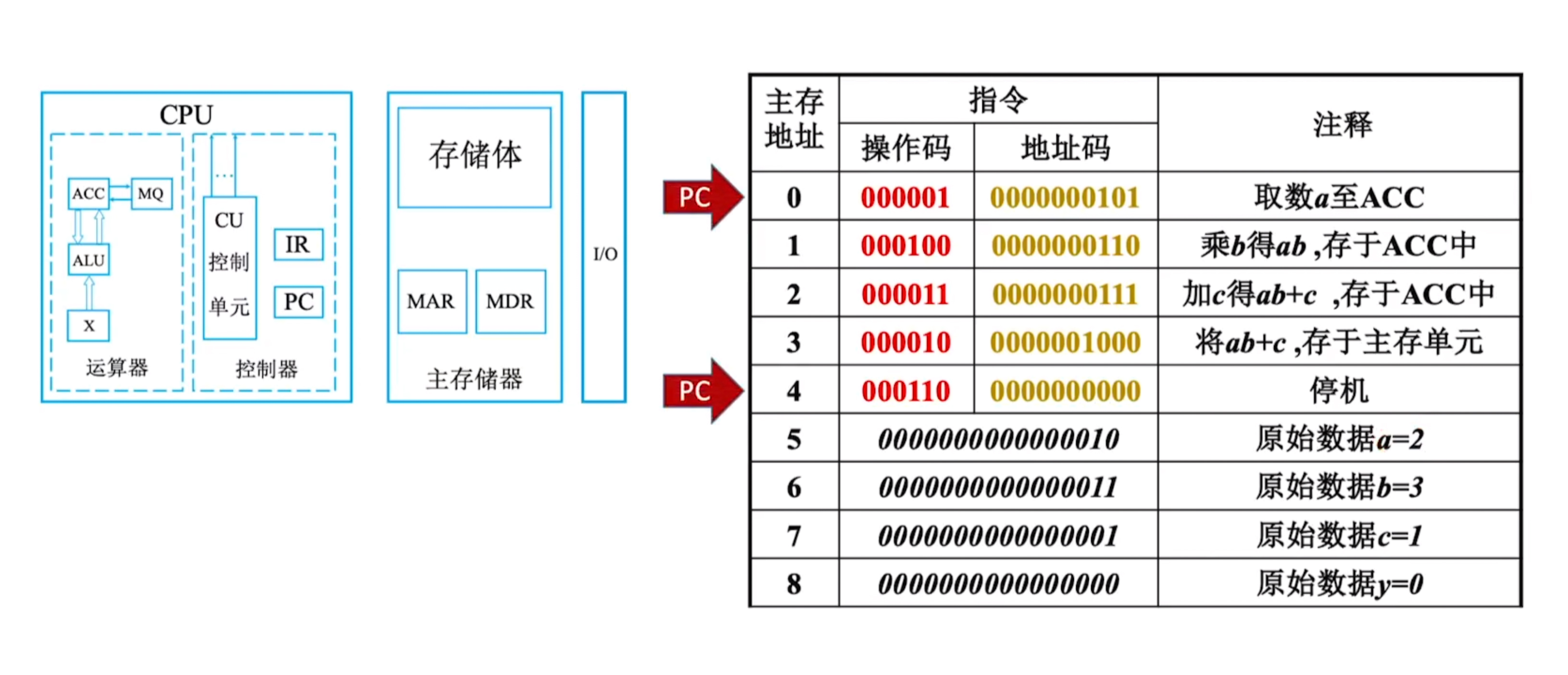 可以把这个高级语言翻译成机器能读得懂的机器语言,同时把这段程序装入主存,如下图所示