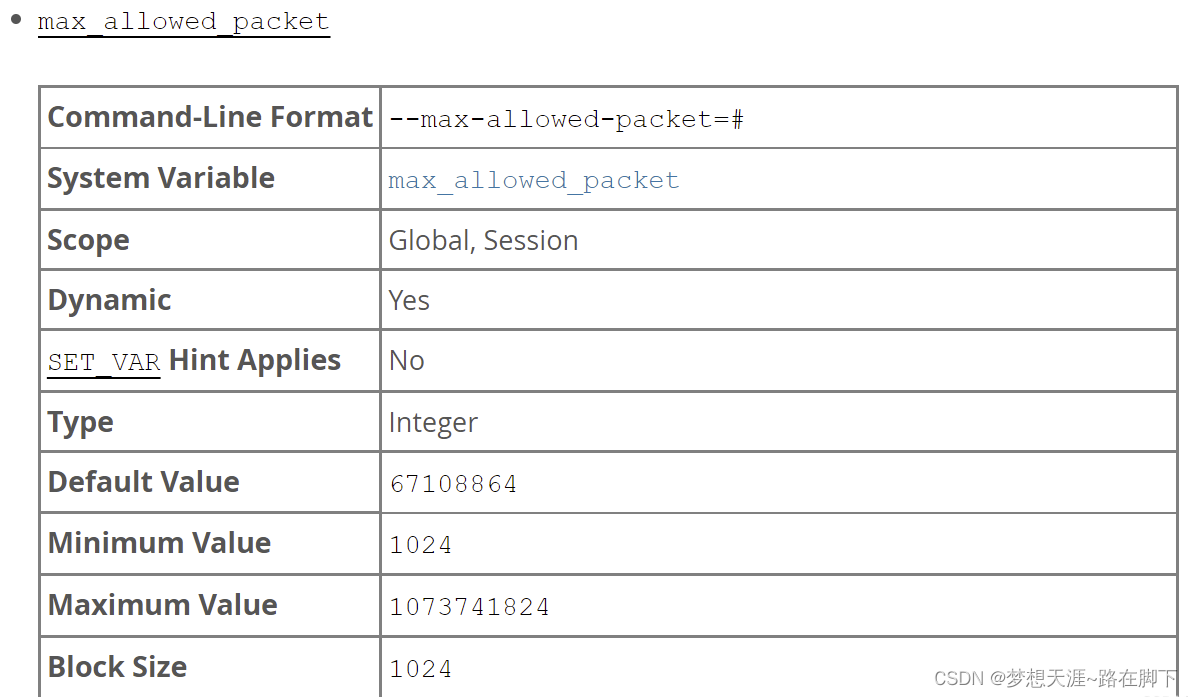 max_allowed_packet 最大值为1G,最小值为1K,默认值为4M,值为1024的倍数。