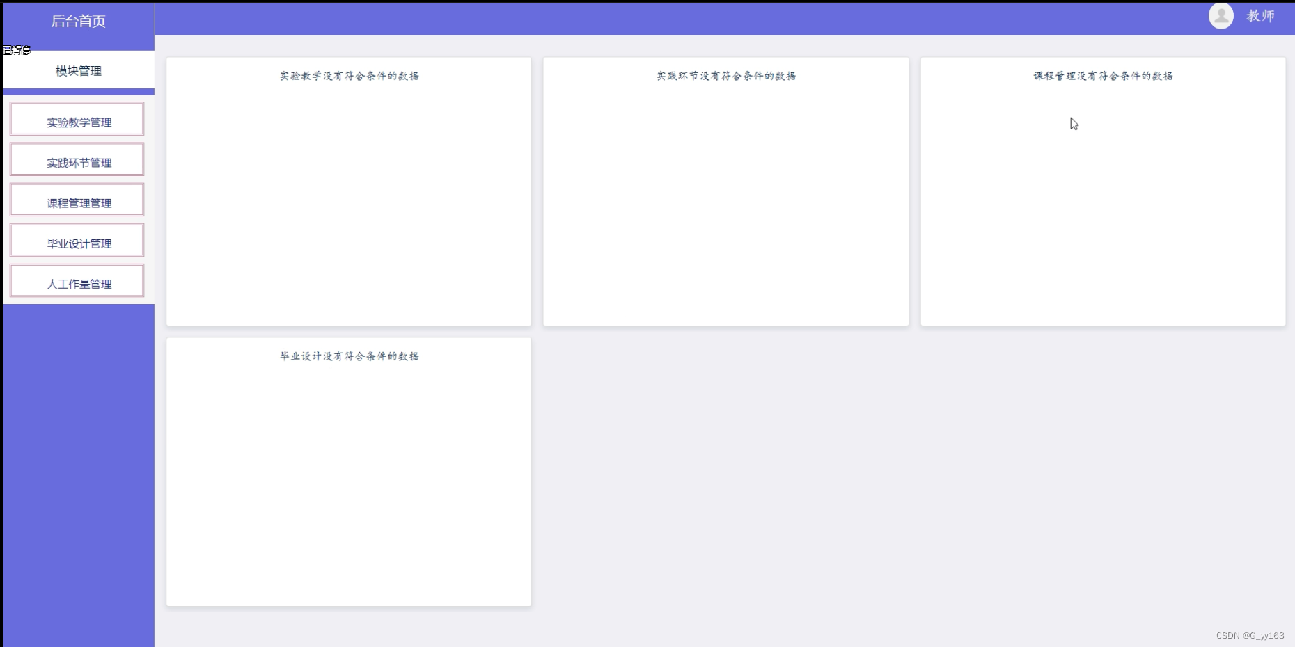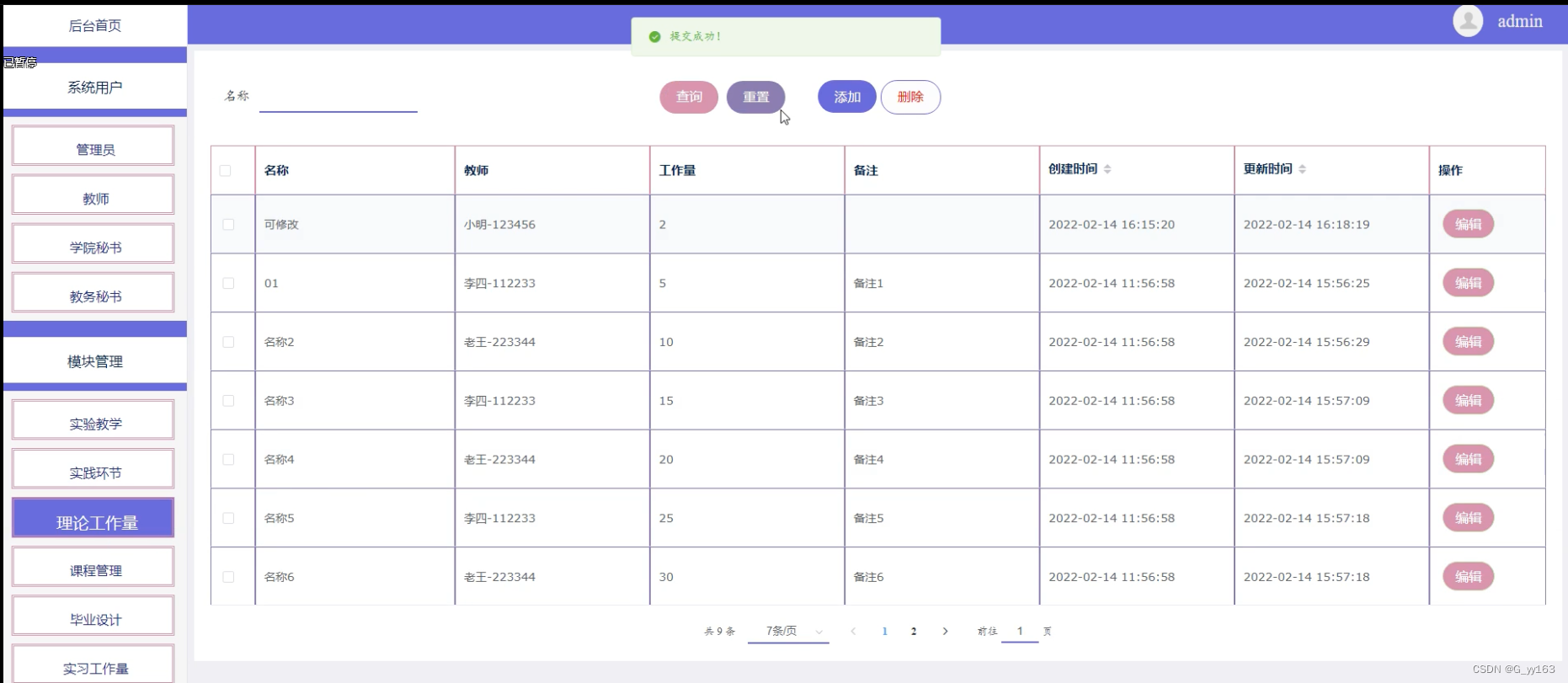 The teacher workload management system mainly completes the design of multi-functional query module and dynamic calculation of teacher workload conversion, so as to accurately and quickly complete all data statistics related to teacher work and teaching workload, and solve the problems of complex calculation methods and low work efficiency.