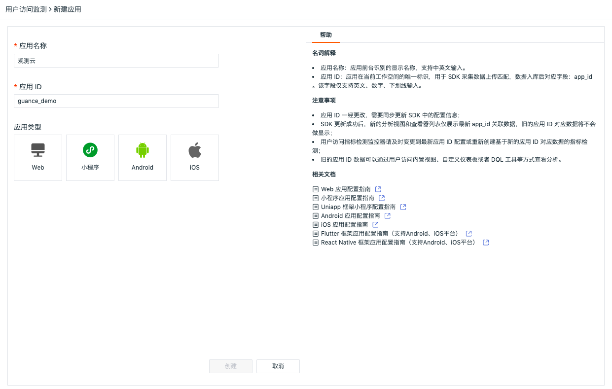 用户访问监测支持用户自定义应用 ID 作为当前工作空间的唯一标识(原观测云的应用 ID 是全局唯一,即不同空间的应用 ID 也不可重复),不同工作空间可使用相同的应用 ID 作为同一应用的唯一标识,用于 SDK 采集数据上传匹配。更多详情可查看文档: