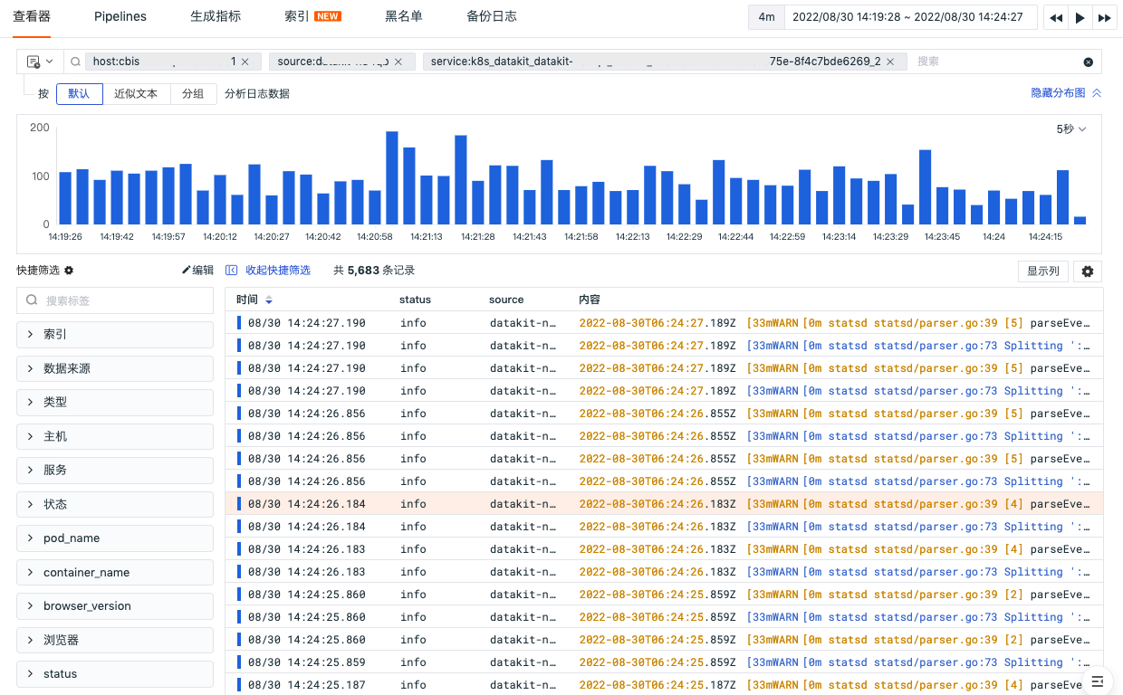 在日志详情页查看上下文打开新的日志查看器时,会以 “host”、“source”、“service”、“filename” 为筛选条件,查看当前日志时间前后的数据。