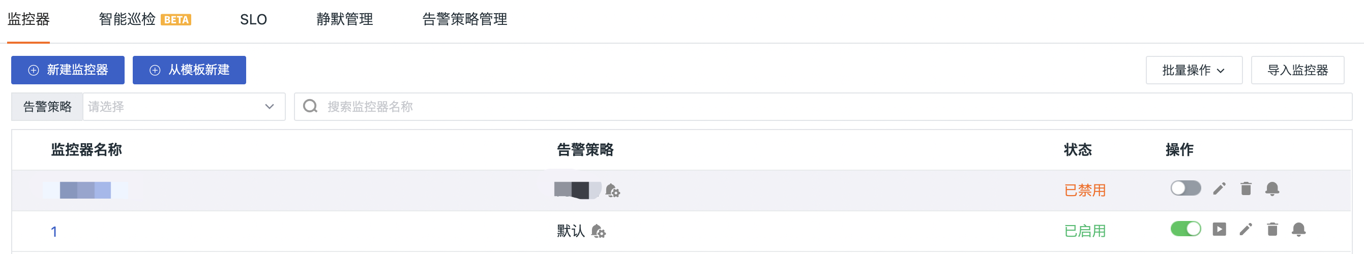 在「监控器」,原「分组」筛选调整为「告警策略」筛选,支持在配置监控器时选择告警策略,支持点击监控器的告警策略修改告警设置。