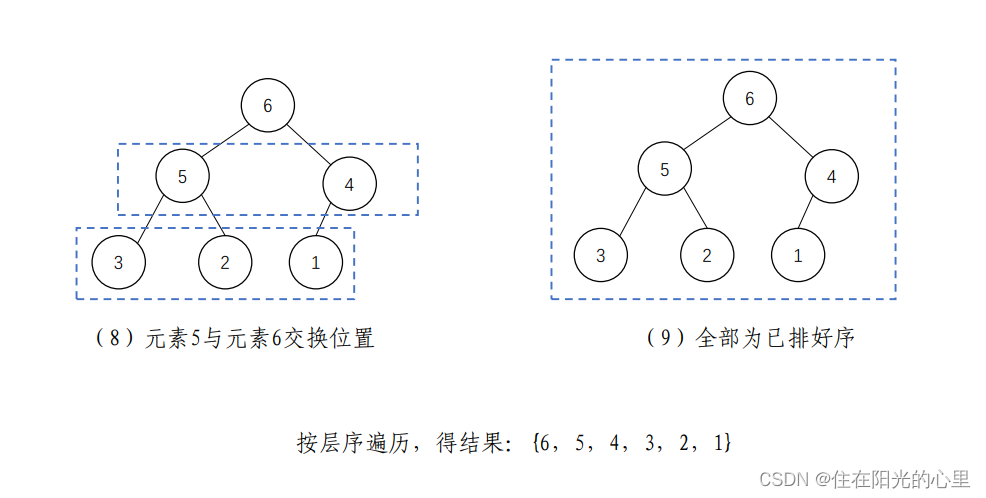(2)并将其排序成降序数组,则是依次将堆顶元素与待排序序列中最后一个元素交换位置,再将待排序序列调整为小根堆。反复重述上述操作,直到全部元素都已排好序。如下图所示: