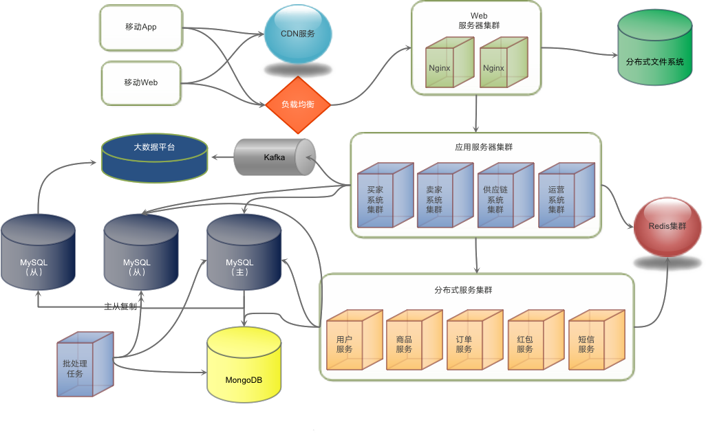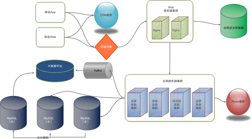 分析上图架构。应用端主要是移动端的应用,通过负载均衡访问 Web 服务器集群,也就是前端集群。前端集群是两台 Nginx 服务器组成的,在 Nginx 再进行一次负载均衡,将用户请求分发到一组应用服务器集群。应用服务器集群按照应用场景分为买家系统、卖家系统、供应链系统以及运营系统四个系统集群,每个系统集群又包含了若干台服务器,所有这些系统都连接到一台 MySQL 服务器上。