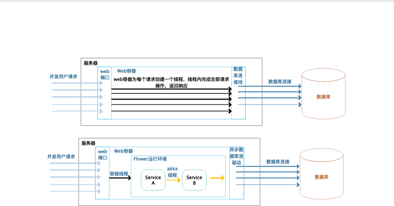 上面提到 Web 应用主要的线程阻塞,是因为数据库的访问导致的线程阻塞。Flower 支持异步数据库驱动,用户请求数据库的时候,将请求提交给异步数据库驱动,立刻就返回,不会阻塞当前线程,异步数据库访问连接远程的数据库,进行真正的数据库操作,得到结果以后,将结果以异步回调的方式发送给 Flower 的 Service 进行进一步的处理,这个时候依然不会有线程被阻塞。也就是说使用 Flower 开发的系统,在一个典型的 Web 应用中,几乎没有任何地方会被阻塞,所有的线程都可以被不断复用,有限的线程就可以完成大量的并发用户请求,从而极大地提高了系统的吞吐能力,也极大地提高了系统的响应时间。