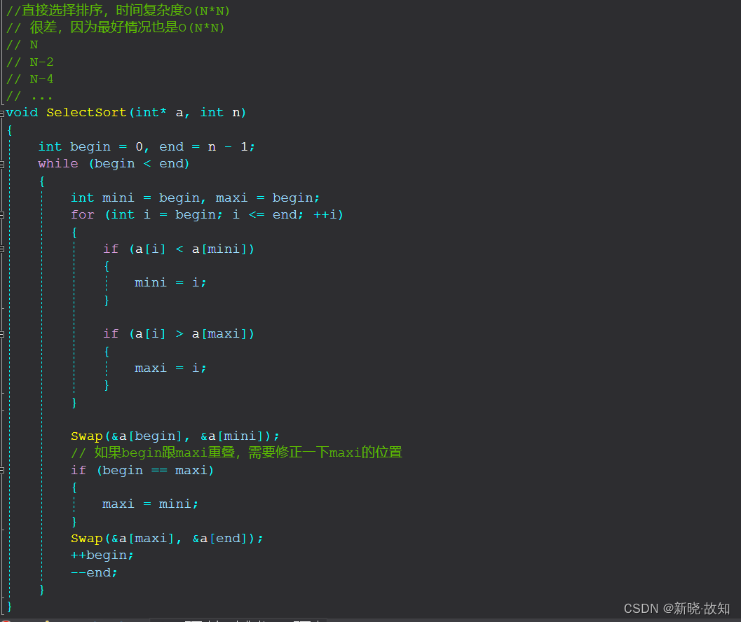 #include"Sort.h" #include"Stack.h" //这里采用升序讲解 //打印 void PrintArray(int* a, int n) { for (int i = 0; i < n; i++) { printf("%d ", a[i]); } printf("\n"); } /// //插入排序 //时间复杂度:O(N^2) //最坏情况:逆序 //最好情况:全部顺序 O(N) void InsertSort(int* a, int n) { //假设[0,end]有序,将end+1位置的值插入进去,让[0,end+1]有序 for (int i = 0; i < n - 1; i++) { int end = i; int tmp = a[end + 1]; while (end >= 0) { if (a[end] > tmp) //升序 //if (a[end] < tmp) //降序 { a[end + 1] = a[end]; --end; } else { break; } } a[end + 1] = tmp; } } // //希尔排序 //在直接插入排序的基础上优化 //1.先进行预排序(分组排序),让数据接近有序 //2.再直接插入排序, //多组间隔为gap的预排序,gap由大变小, //gap越大(以升序举例),大的数可以越快的到后面,小的数可以越快的到前面。但预排后越不接近有序 //gap越小,越接近有序 //时间复杂度:O(logN*N)或者O(log3N*N) //gap很大时,下面预排序为O(N) //gap很小时,数据已接近有序,近似为ON) //平均时间复杂度:O(N^1.3) void ShellSort(int* a, int n) { int gap = n; //可以自行设置,但不会给固定的值 //把间隔为gap的多组数据同时排序(注意:理解这个多组的含义) //end最终位置:n-gap-1 //gap的设置方式之一: while(gap > 1) { //gap=gap/2; //一定会保证最后一次为1 //运行了logN次 gap = gap / 3 + 1; //但要保证最后一次为1 //运行了log3N次 //gap>1时都是预排序,排序后接近有序 //gap==1时,就是直接插入排序 for (int i = 0; i < n - gap; i++) { int end = i; int tmp = a[end + gap]; while (end >= 0) { if (a[end] > tmp) { a[end + gap] = a[end]; end -= gap; } else { break; } } a[end + gap] = tmp; } } } / //堆排序 void Swap(int* p1, int* p2) { int tmp = *p1; *p1 = *p2; *p2 = tmp; } //(1)建小堆,向上调整,最终为大堆---- - 用于堆排降序 //(2)建大堆,向上调整,最终为小堆---- - 用于堆排升序 //(3)建小堆,向下调整,最终为大堆---- - 用于堆排降序(可以实现,多此一举) //(4)建大堆,向下调整,最终为小堆---- - 用于堆排升序 //注:由于向上调整法的时间复杂度比向下调整法的时间复杂度高,因此一般采用向下调整法。 //堆排序,采用数组存储,操作下标。但逻辑要是二叉树 //把数据建成堆 //1.堆排序调整-向下调整法 void AdjustDwon(int* a, int n, int root) { int parent = root; int child = parent * 2 + 1; // 默认是左孩子 //1.建大堆,再调整 while (child < n) { // 1、选出左右孩子中大的那一个 if (child + 1 < n && a[child + 1] > a[child]) { child += 1; } if (a[child] > a[parent]) { Swap(&a[child], &a[parent]); parent = child; child = parent * 2 + 1; } else { break; } } 2.建小堆,再调整 //while (child < n) //{ // // 1、选出左右孩子中小的那一个 // if (child + 1 < n && a[child + 1] < a[child]) // { // child += 1; // } // if (a[child] < a[parent]) // { // Swap(&a[child], &a[parent]); // parent = child; // child = parent * 2 + 1; // } // else // { // break; // } //} } //2.堆排序调整-向上调整法 void AdjustUp(int* a, int child) { int parent = (child - 1) / 2; //1.建大堆,再调整 while (child > 0) { if (a[child] > a[parent]) { Swap(&a[child], &a[parent]); child = parent; parent = (child - 1) / 2; } else { break; } } 2.建小堆,再调整 //while (child > 0) //{ // if (a[child] < a[parent]) // { // Swap(&a[child], &a[parent]); // child = parent; // parent = (child - 1) / 2; // } // else // { // break; // } //} } //堆排序(建堆) // 升序,建小堆?还是大堆? -> 大堆 // 建堆只是第一步,并非最终形态,还要进行调整(一般选择向下调整) // 整体时间复杂度O(N*logN) void HeapSort(int* a, int n) { // 建堆 时间复杂度:O(N) //调整 1.向上调整法 //for (int i = 1; i < n; ++i) //{ // AdjustUp(a, i); //} //2.向下调整法 for (int i = (n - 1 - 1) / 2; i >= 0; --i) { AdjustDwon(a, n, i); } // 排升序,采用向下调整法,那么,建大堆还是小堆? -->建大堆 int end = n - 1; while (end > 0) { Swap(&a[0], &a[end]); AdjustDwon(a, end, 0); --end; } } / //直接选择排序,时间复杂度O(N*N) // 很差,因为最好情况也是O(N*N) // N // N-2 // N-4 // ... void SelectSort(int* a, int n) { int begin = 0, end = n - 1; while (begin < end) { int mini = begin, maxi = begin; for (int i = begin; i <= end; ++i) { if (a[i] < a[mini]) { mini = i; } if (a[i] > a[maxi]) { maxi = i; } } Swap(&a[begin], &a[mini]); // 如果begin跟maxi重叠,需要修正一下maxi的位置 if (begin == maxi) { maxi = mini; } Swap(&a[maxi], &a[end]); ++begin; --end; } } / //冒泡排序 // 时间复杂度:O(N*N) // 最好情况:O(N) // N-1 // N-2 // ... // 跟直接插入排序相比?谁更好 -> 直接插排序入更好 void BubbleSort(int* a, int n) { //写法1: for (int j = 0; j < n; ++j) { int exchange = 0; for (int i = 1; i < n - j; ++i) { if (a[i - 1] > a[i]) { Swap(&a[i - 1], &a[i]); exchange = 1; } } if (exchange == 0) { break; } } 写法2: //int end = n; //while (end > 0) //{ // for (int i = 1; i < end; ++i) // { // if (a[i - 1] > a[i]) // { // Swap(&a[i - 1], &a[i]); // } // } // --end; //} } / 快速排序——写法1:挖坑法(单趟分析版) 单趟排序时间复杂度:O(N) //void QuickSort(int* a, int n) //{ // int begin = 0, end = n - 1; // int pivot = begin; // int key = a[begin]; //指定了第一次关键字为begin // // while (begin < end) // { // //右边找小,放到左边 // while (begin < end && a[end] >= key) // { // --end; // } // //小的放到左边的坑里,自己形成新的坑位 // a[pivot] = a[end]; // pivot = end; // //左边找大 // while (begin < end && a[begin] <= key) // { // ++begin; // } // //大的放到左边的坑里,自己形成新的坑位 // a[pivot] = a[begin]; // pivot = begin; // // } // pivot = begin; // a[pivot] = key; //} 快速排序——写法1:挖坑法(实现排序版) 时间复杂度: 最坏情况:有序-->O O(N^2) ,性能相