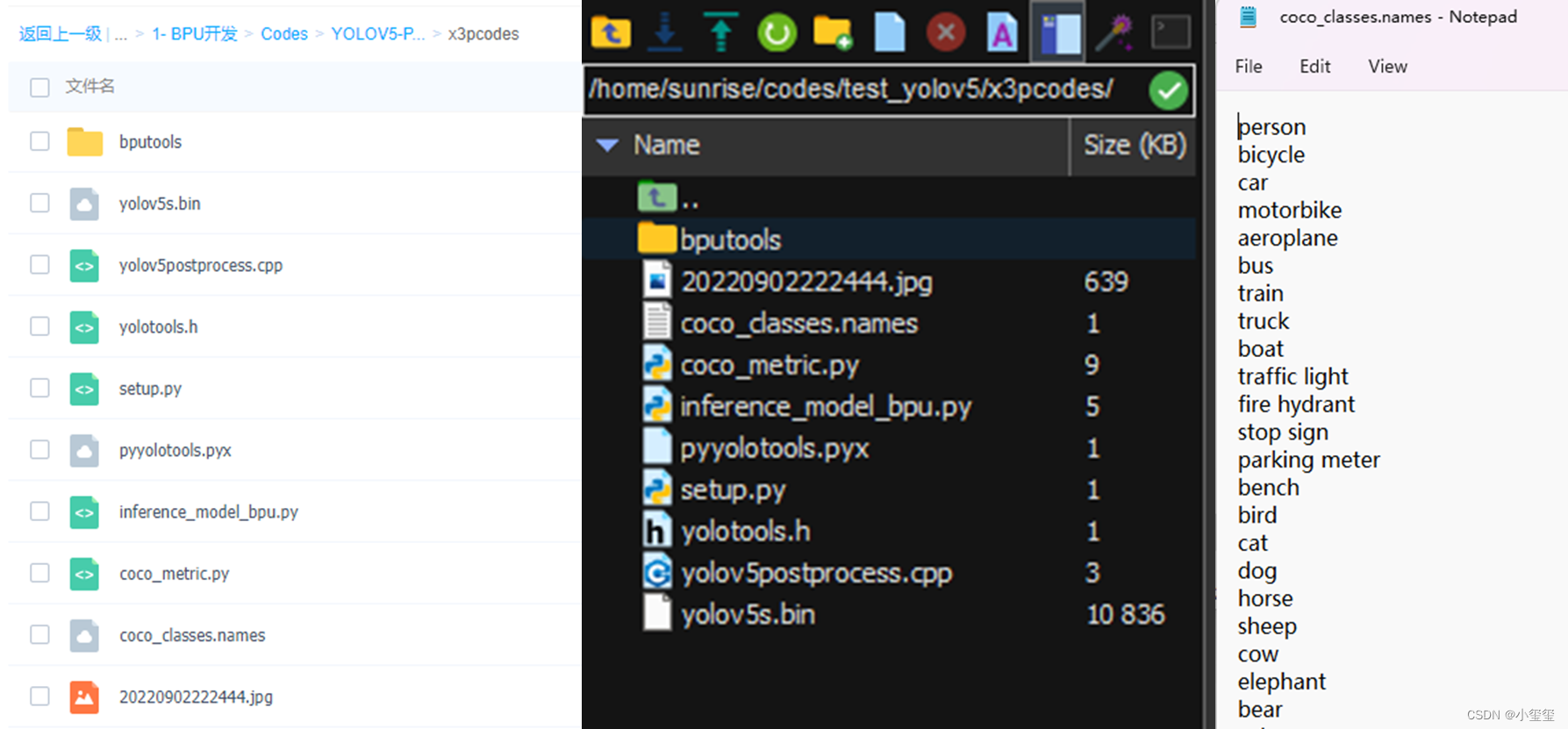 下载百度云的文件,拷贝到旭日X3派开发板中,其中yolov5s.bin就是我们转换后的模型,coco_classes.names仅用在画框的时候,如果用自己的数据集的话,参考coco_classes.names创建个新的名字文件即可。