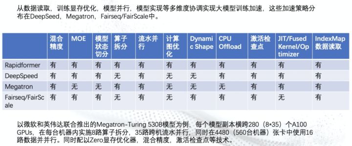 下图对比了Rapidformer,Megatron,DeepSpeed三者之间的加速能力差异,Rapidformer融合了Megatron和DeepSpeed的各自的优点,提供了一个统一的训练环境。