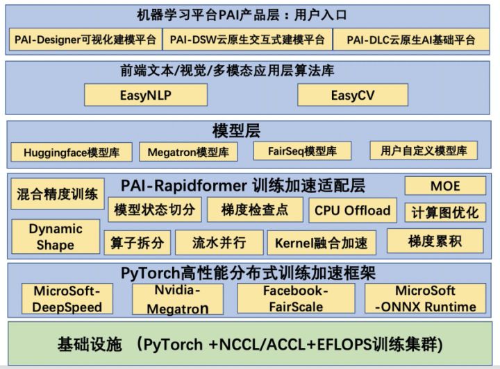 Rapidformer的定位是为Transformer模型库提供大模型大数据量的训练加速能力。这是通过有机整合微软的DeepSpeed,英伟达的Megatron以及Meta的FairScale来做到的。如下图所示: