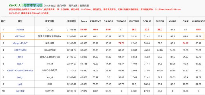 继去年使用Transformer Encoder大模型取得中文小样本学习、英文预训练模型知识量度量双冠后,今年阿里云又在中文语言理解权威评测基准CLUE的中文零样本学习权威榜单ZeroCLUE上取得冠军。我们将大模型技术能力向前推进了一大步。基于MoE稀疏结构,仅用一台A100就把160亿参数量级的多任务通用GPT模型训练成熟。此次刷榜的模型是阿里云机器学习PAI团队推出的 GPT-MoE,这也是业界推出的首个稀疏的纯decoder架构模型在zeroclue上登顶。这是通往低成本且高性能多任务通用自然语言理解的重要里程碑。