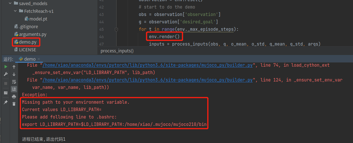 在Ubuntu系统中安装完mujoco环境,并在.bashrc文件中export了环境变量路径,能够在命令行中正常运行mujoco的图形化展示代码,但是在PyCharm中运行时却出现了未找到环境变量的报错,如下: