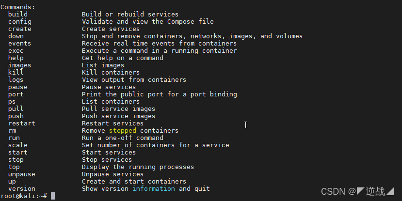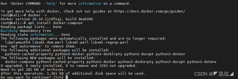 然后输入y就可以。安装完毕后,输入docker-compose,显示下面页面,安装成功!