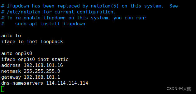有时候根据方法一操作,仍然不能成功设置静态IP,原因一般是系统里面安装过ifupdown命令。这个命令会根据/etc/network/interfaces这个文件里的配置信息来设置网卡,会覆盖掉上面方法一中的设置,导致不起作用。这时候我们只需修改/etc/network/interfaces这个文件即可。