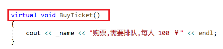 - cout << _name << "购票,需要排队,每人 100 ¥" << endl;