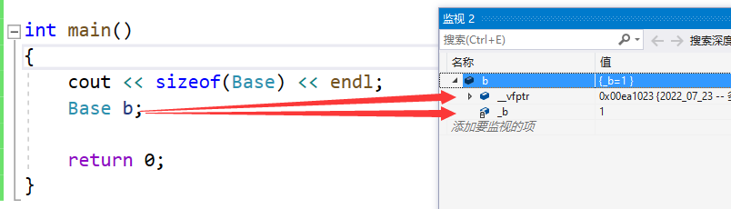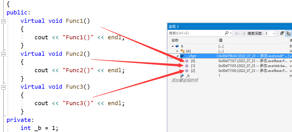 通过测试我们发现b对象是8bytes,而不是4bytes,通过调试我们发现,除了_b成员,还多了一个_vfptr放在对象的前面,对象中的这个指针我们叫做虚函数表指针(v代表virtual,f代表function),一个含有虚函数的类中都至少有一个虚函数表指针,因为虚函数的地址要被放到虚函数表中,虚函数表也简称虚表。