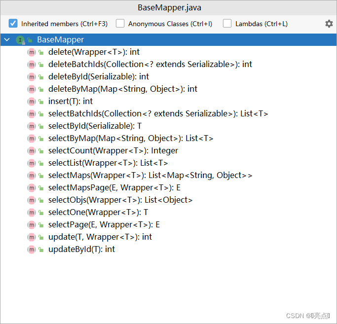 核心在于Dao接口继承了一个BaseMapper的接口,这个接口中帮助开发者预定了若干个常用的API接口,简化了通用API接口的开发工作。