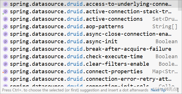 注意观察,配置项中,在datasource下面并不是直接配置url这些属性的,而是先配置了一个druid节点,然后再配置的url这些东西。言外之意,url这个属性是druid下面的属性,那你能想到什么?除了这4个常规配置外,还有druid专用的其他配置。通过提示功能可以打开druid相关的配置查阅
