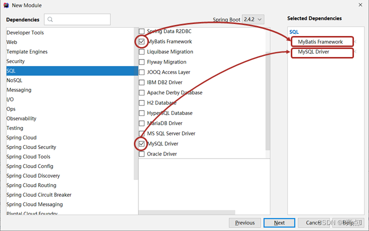 步骤②:勾选要使用的技术,MyBatis,由于要操作数据库,还要勾选对应数据库