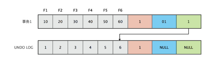 假设 F1~F6 是表中字段的名字,1~6 是其对应的数据。后面三个隐含字段分别对应该行的隐含ID、事务号和回滚指针,如下图所示。